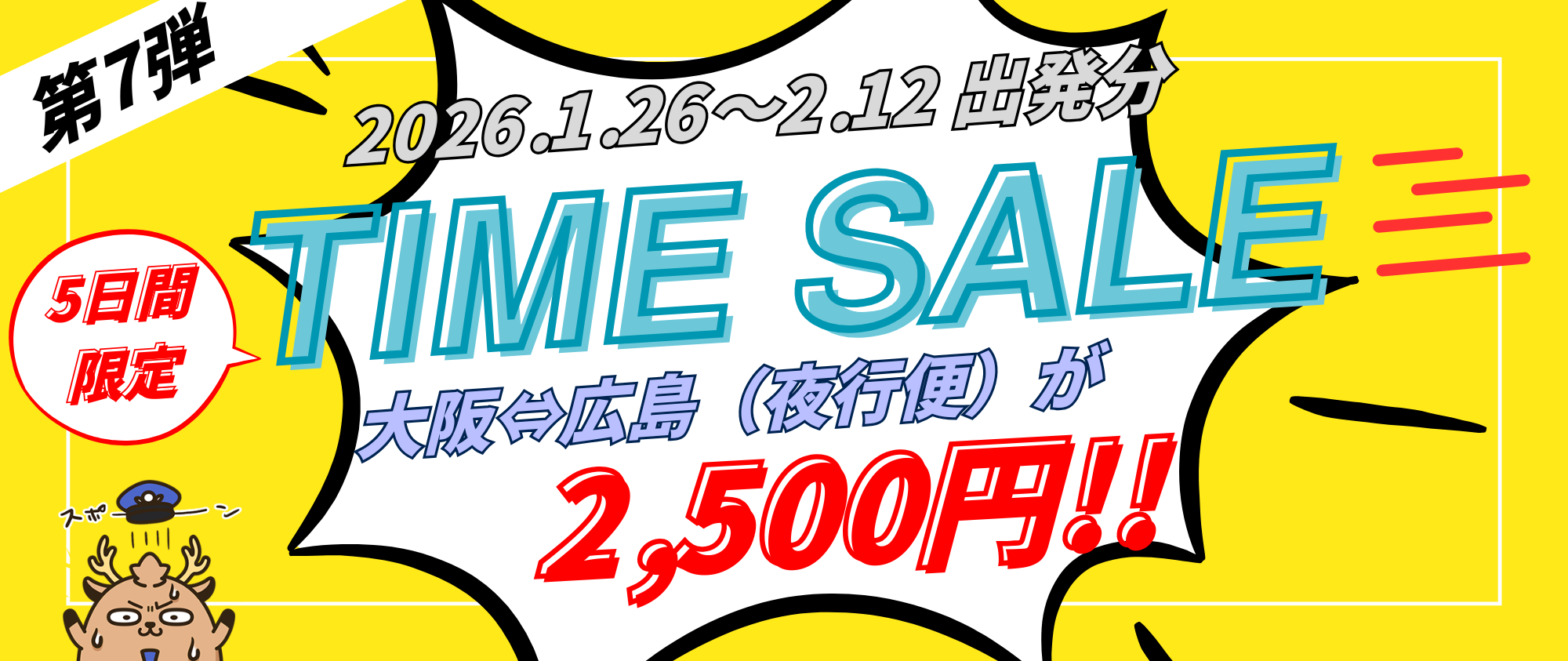 2026年1月26日~1月30日の5日間限定で、1月26日~2月12日運行分の大阪⇔広島線「青春広島ドリーム大阪号」のタイムセールを開催します!