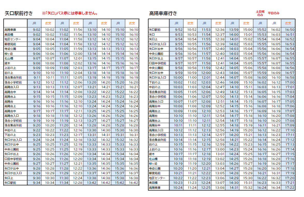 実証運行期間中の9時台~16時台において、「矢口が丘・高陽台」を経由する便の