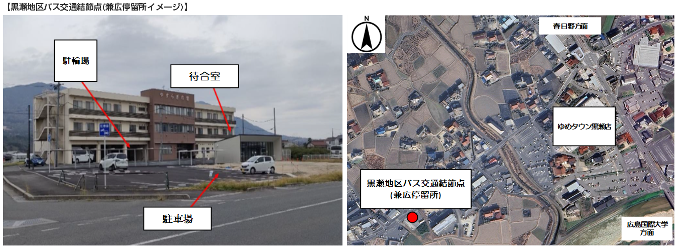東広島市が整備する黒瀬地区バス交通結節点(兼広停留所)への乗り入れを開始します。当該施設は自家用車駐車場や駐輪場、冷暖房完備の待合室を備えており、バス同士のみならず、自家用車や自転車等とバスの乗り継ぎ利便が向上し、待合環境も大きく改善されます。