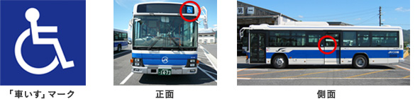 また、一般乗合バスは車椅子の乗降に対応したノンステップ・ワンステップの低床バスの導入を順次進めておりますので、車体正面および側面の「車椅子」マーク(下図)のあるバスをぜひご利用ください。