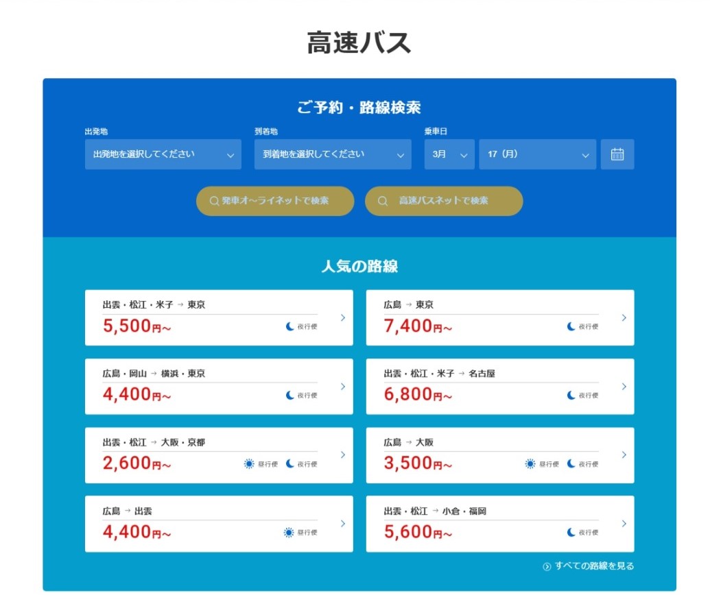 高速バス路線検索からそのまま「発車オ~ライネット」または「高速バスネット」で予約が出来ます。