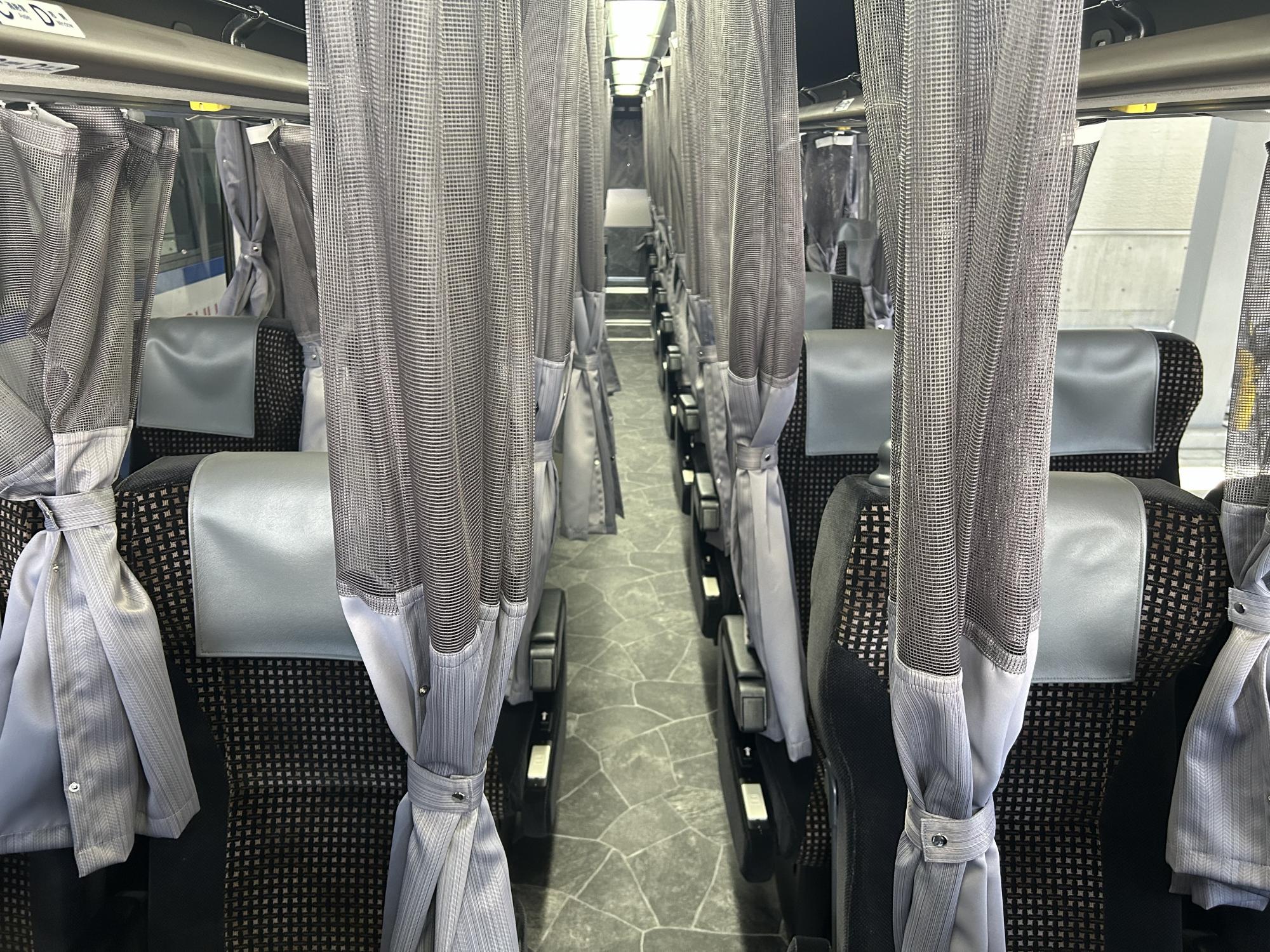 客席は安心のトイレ付4列シートで、通常のシートより幅の広い「ワイドシート」を採用。もちろんコンセントも完備しており、4列シートでも隣同士が気にならないプライベートカーテンも付いています。さらに、このバスでは通路側にもカーテンを付けることにより、プライベート空間が保たれています。