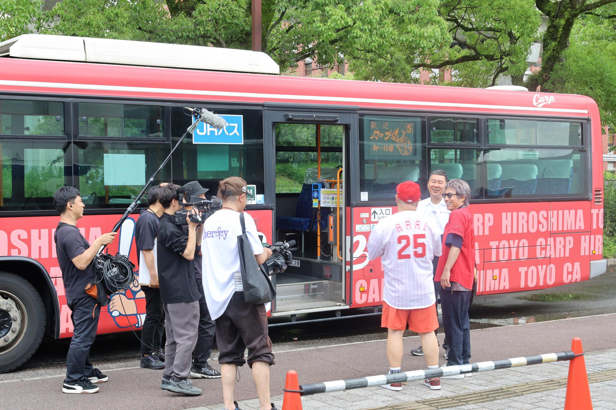 毎週火曜日深夜0時15分から放送中の広島ホームテレビ「カープ道」の番組撮影協力を行いました。今回の撮影では、お笑いコンビの「極楽とんぼ 山本圭壱さん」「ロンドンブーツ1号2号 田村淳さん」がゲストとして出演されており、当社のカープラッピングバスでカープゆかりの地を巡りました。田村さんから、「ロケ車にしては小回りが利かないじゃない?!」という鋭いツッコミがありましたが、番組特別仕様の行先表示で皆さんに喜んでいただきました。