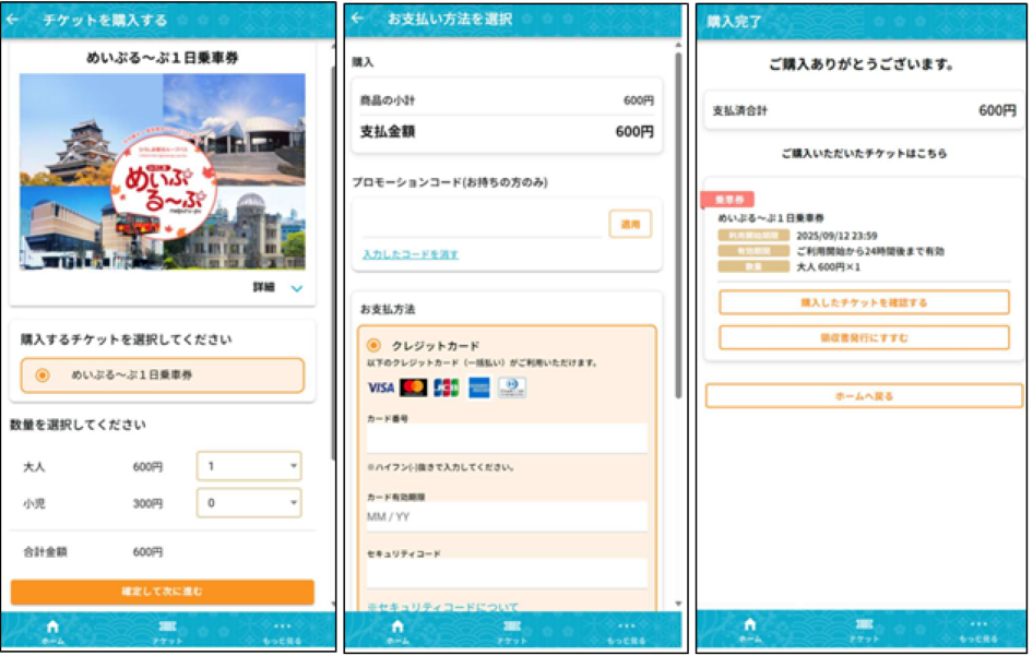 広島市中心部の観光地や美術館を便利に回ることのできる、ひろしま観光ループバス「ひろしま めいぷる~ぷ」の1日乗車券をお客様のスマートフォンから購入し、乗車時にチケット画面を見せて簡単にご利用できるようになります。