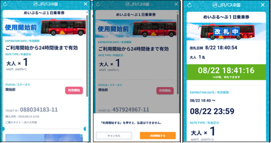 ・ 乗車時に予め販売サイトで購入した1日乗車券(WEB版)の「改札中」の画面をスマートフォンの画面に表示し、バスの運転手に呈示してください。