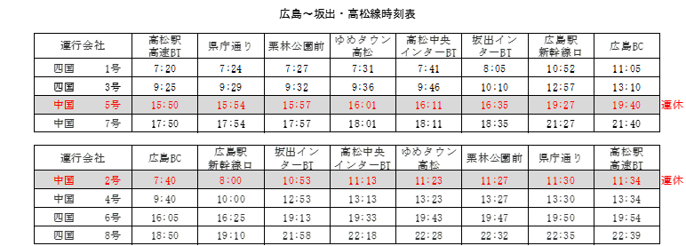 高速バス「広島~坂出・高松線」及び「広島~小倉・福岡線」の一部便の運休について