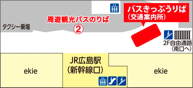 - 広島駅新幹線口到着後も引き続きご乗車されるお客様はバスを乗り換えていただきます。乗務員へ引き続きご乗車される旨をお申し出いただき、乗り換え券をお受け取りください。