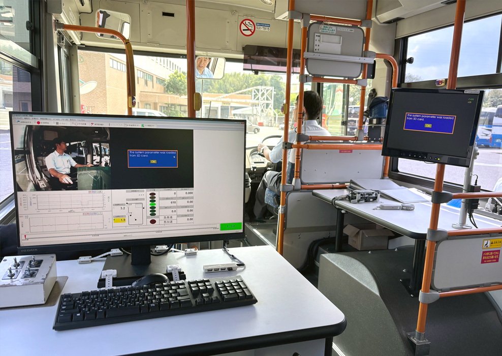 走行研修では、教育訓練車のアイマークカメラを装着し、認知、危険予測、判断、操作が確実に行えているかを検証するとともに、アクセルワークやクラッチミート、ブレーキ操作(当社基準)を動揺センサーで計測します。お客様に不安を与えない運転ができているかを一緒に確認しましょう。